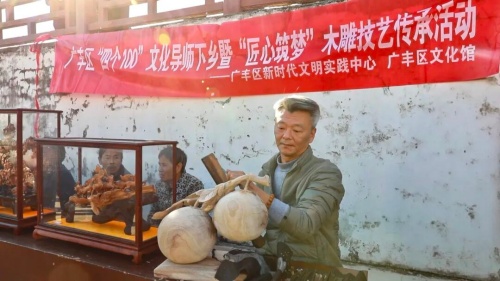 非遗展示区成为此次活动最受关注的焦点,非遗导师黄坚手持刻刀俯身案前,娴熟的雕琢动作行云流水,神情专注笃定,两件圆润饱满的木雕作品已初显雏形、颇具质感。展柜中陈列的另外两件成品更是吸引村民纷纷驻足,作品纹理细腻、造型生动,既保留传统吉祥纹样的古典韵味,又融入乡村生活的质朴元素,尽显匠心巧思。“文化赶集把非遗搬进乡村,特别有意义!”黄坚介绍,此次带来三件木雕作品,就是想让乡亲们近距离感受木雕艺术的魅力。